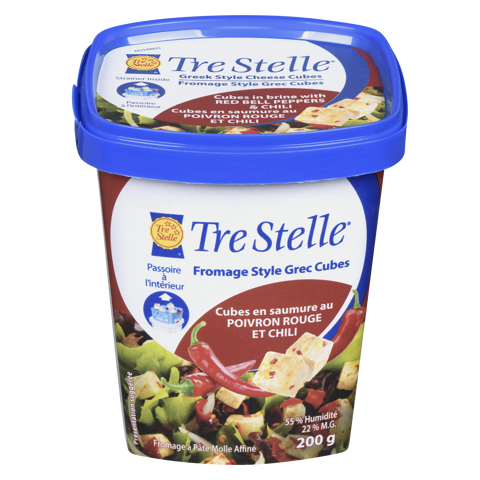 Le fromage à la grecque Tre Stelle en cubes avec poivrons rouges et chilis revisite de manière audacieuse et savoureuse le fromage grec traditionnel. Ces cubes de la taille d'une bouchée combinent la texture onctueuse du fromage à la grecque au goût vif des poivrons rouges et des piments chilis, créant ainsi une délicieuse expérience à savourer comme collation. Idéaux pour agrémenter les salades, les plateaux d'antipasto ou à déguster directement de l'emballage, ces délicieux petits cubes confèrent une touche méditerranéenne relevée à n'importe quel repas.